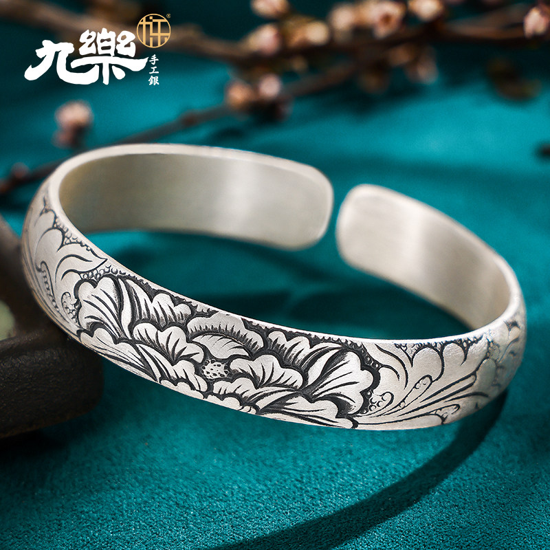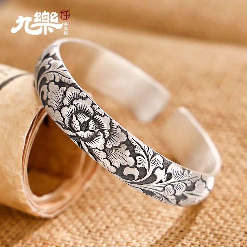 九乐999纯银牡丹花开口手镯女手工浮雕錾刻民族风足银镯送妈妈礼