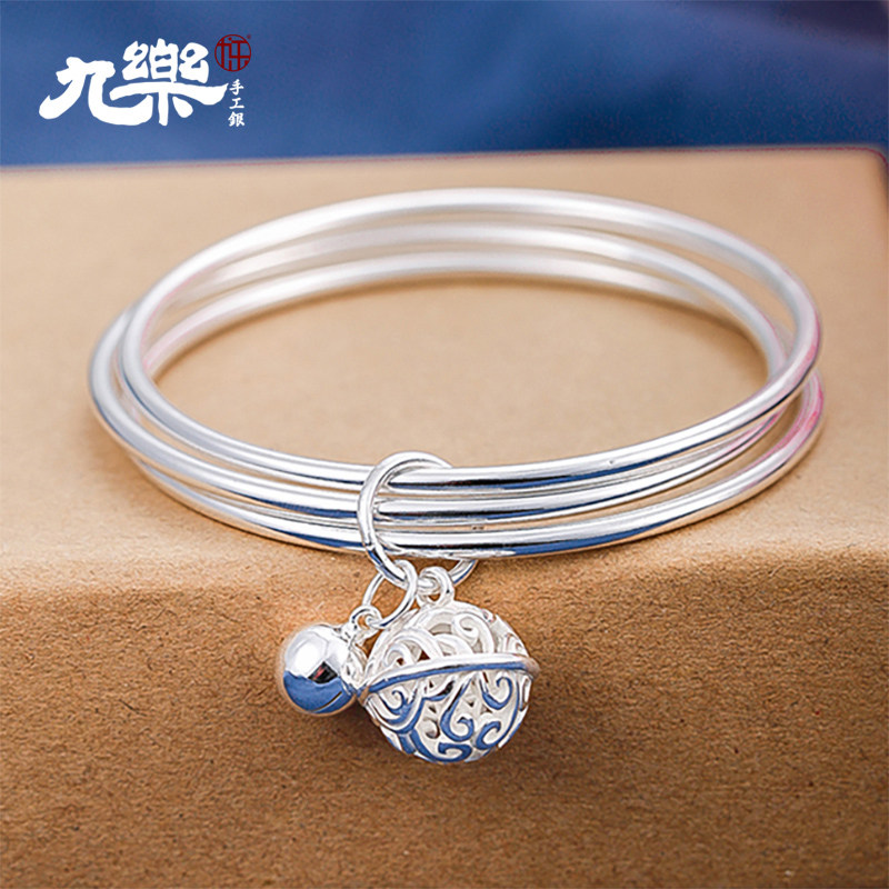 九乐999足银手镯女年轻款细圈古法叮当镯三生三世银手环送女友礼