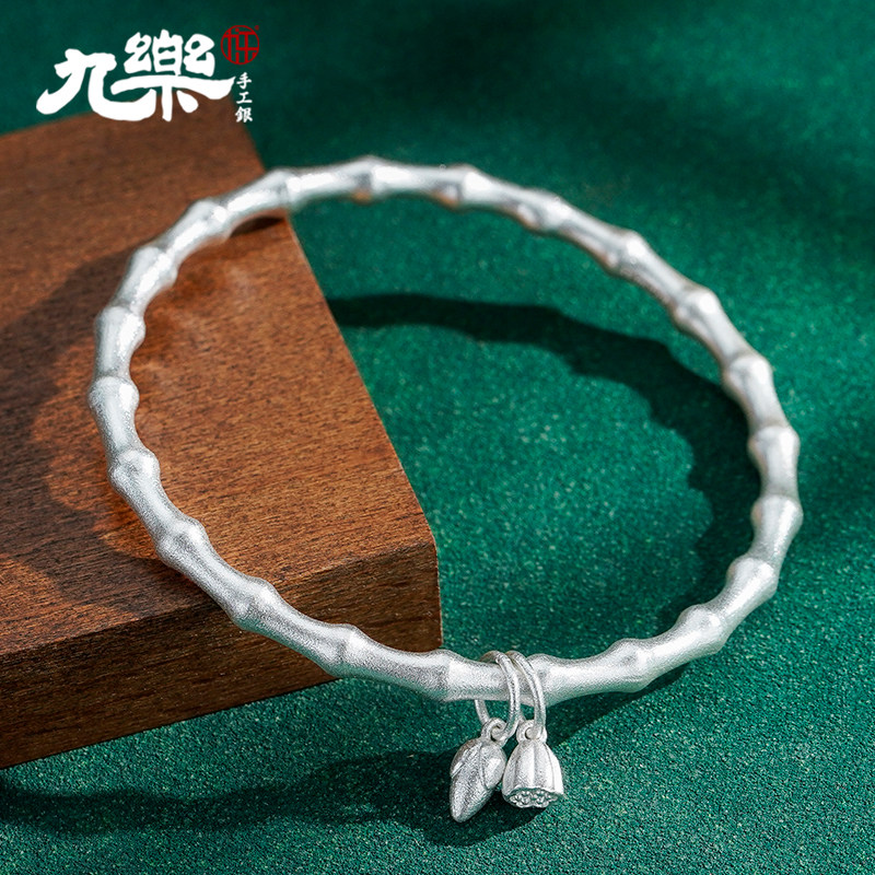 九乐足银999银手镯女竹节莲蓬镯子古法磨砂竹报平安银手环送女友