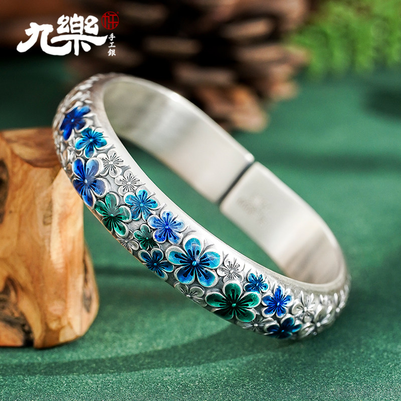 九乐足银999银手镯女纯手工制作珐琅梅花马蹄手镯民族风纯银镯子