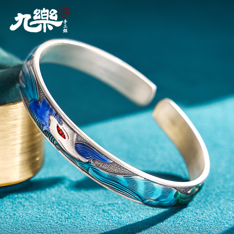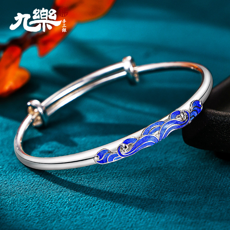 九乐足银999银手镯女低温烧蓝山盟海誓纯银手镯古法传承开口镯子