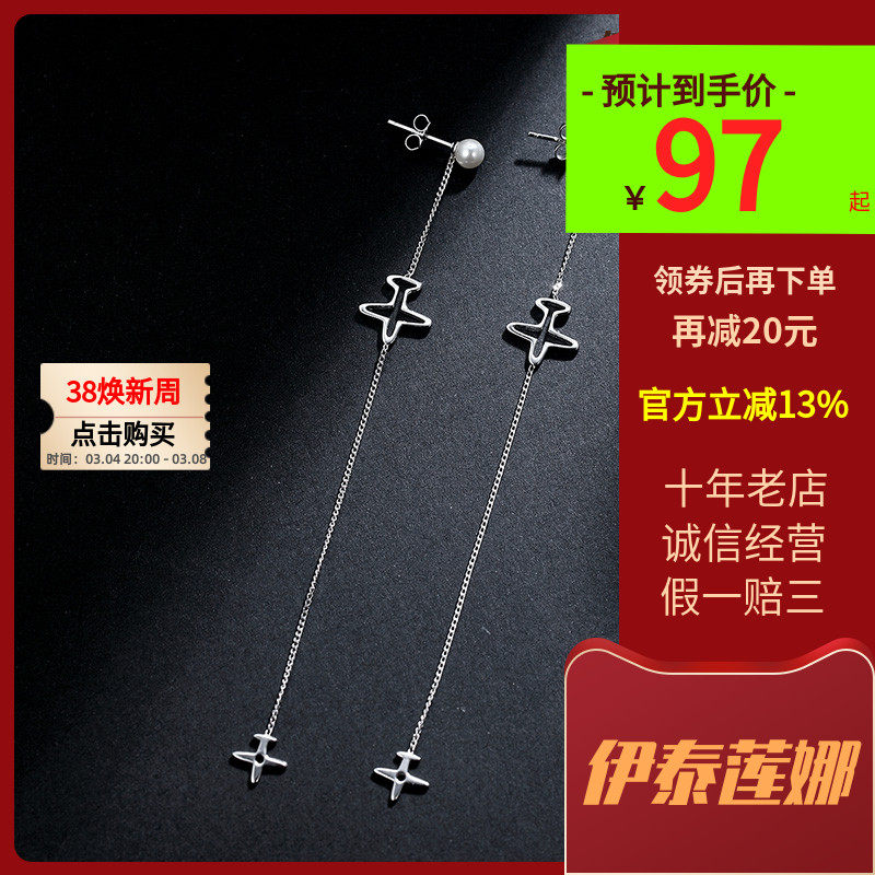 伊泰莲娜S925银耳钉长款仿珍珠网红耳环时尚个性飞机耳饰配饰品女