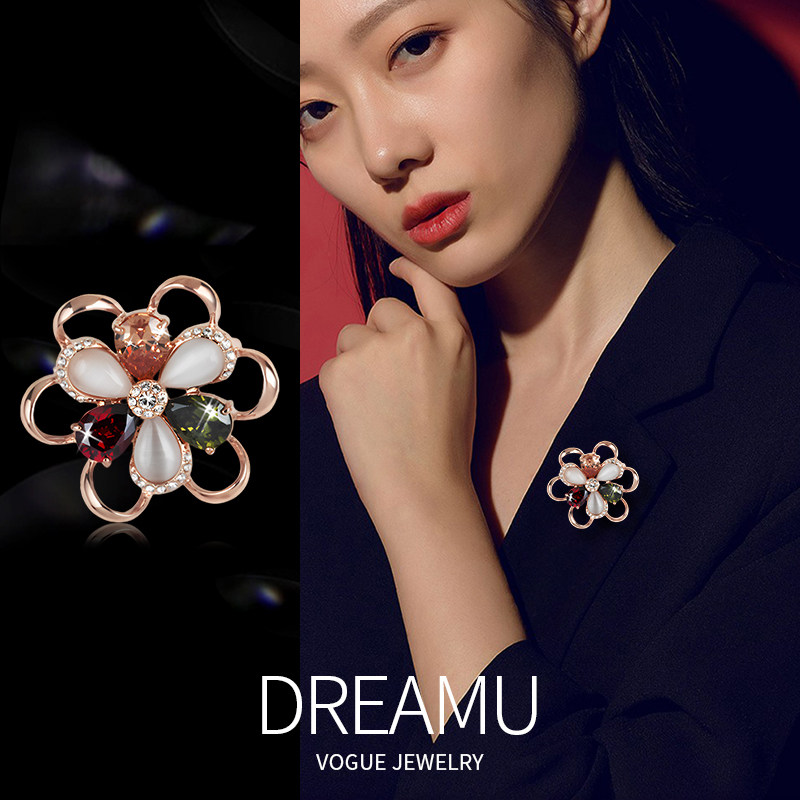 伊泰莲娜高档六叶花猫眼石胸针女水晶胸花精致西装别针配饰品礼物