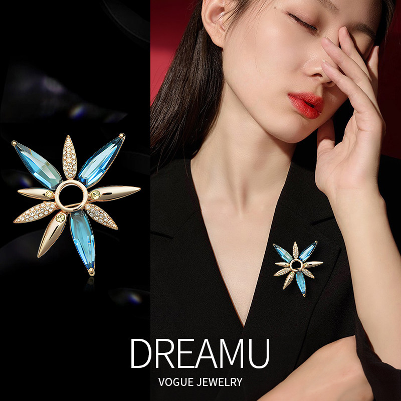 浪漫蓝色花朵仿水晶香槟金胸针轻奢锆石服饰胸花女伊泰莲娜爆款