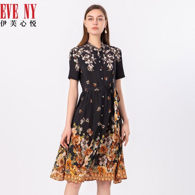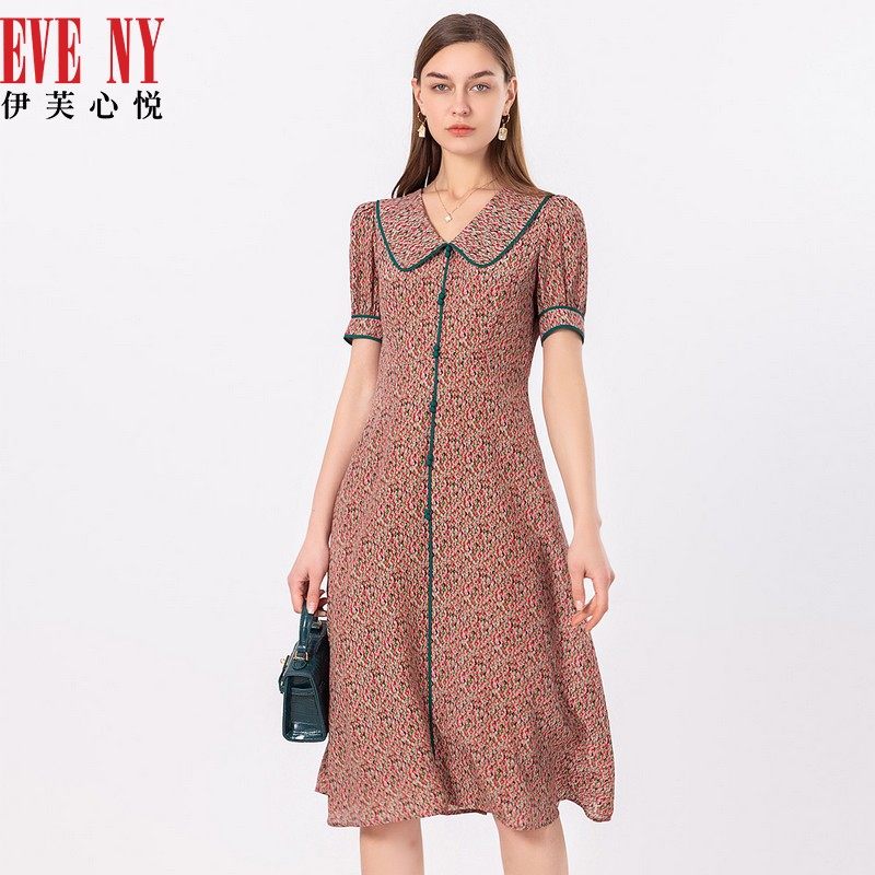 EVENY伊芙心悦夏季新款桑蚕丝翻领印花中长款连衣裙