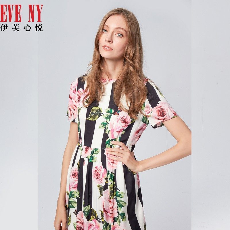 EVENY伊芙心悦热销款优雅清凉桑蚕丝面料玫瑰印花连衣裙女