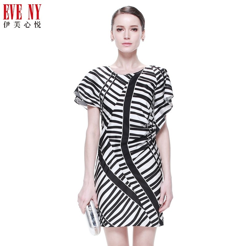 EVENY伊芙心悦春夏桑蚕丝不规则廓形条纹连衣裙