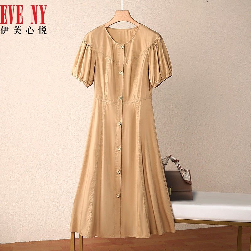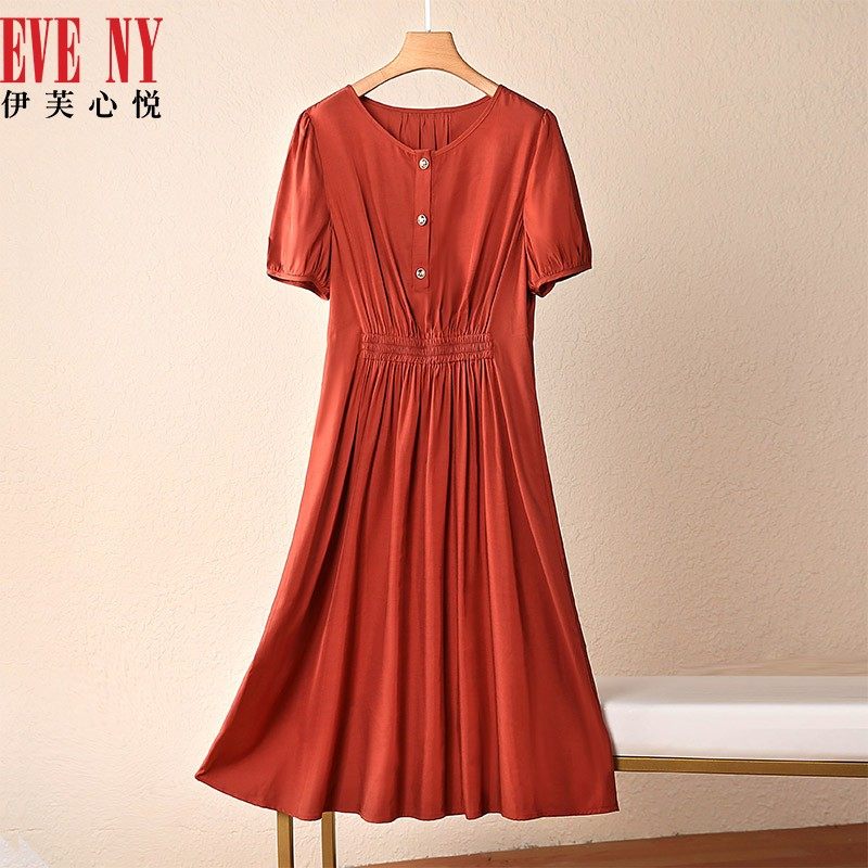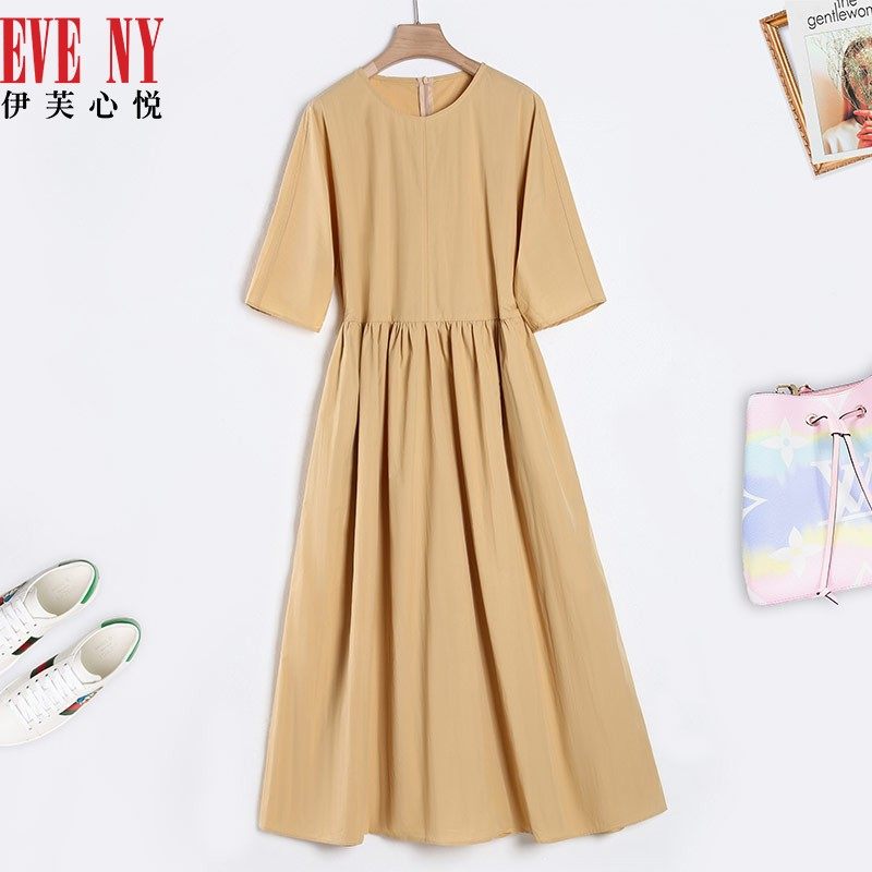 EVENY伊芙心悦夏季新款圆领短袖A字裙松紧收腰简约气质连衣裙女