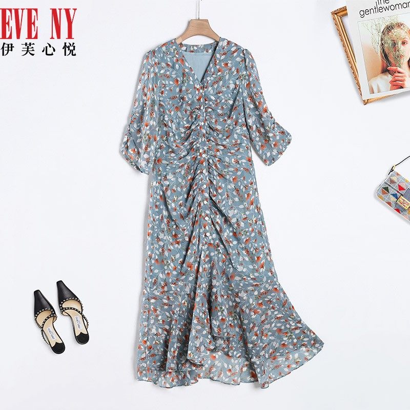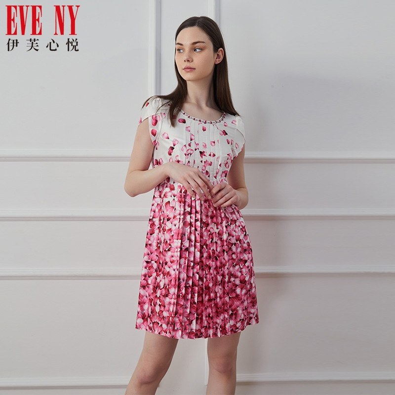 EVENY伊芙心悦春夏季优雅印花不等褶皱连衣裙
