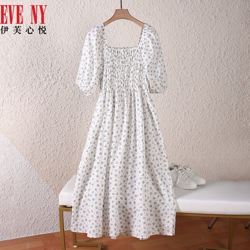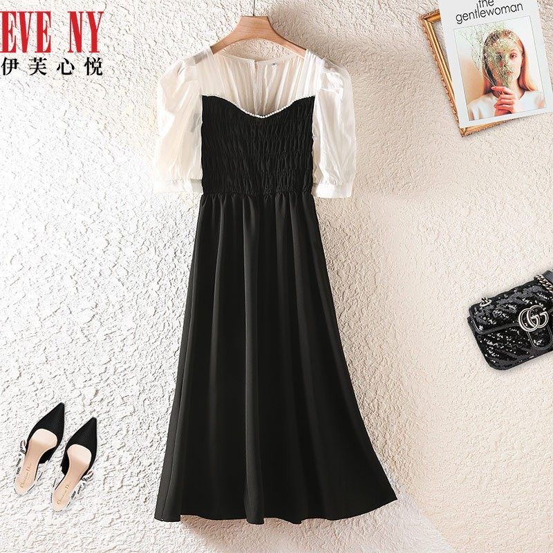 EVENY伊芙心悦夏季新款法式方领中长裙收腰显瘦短袖连衣裙女