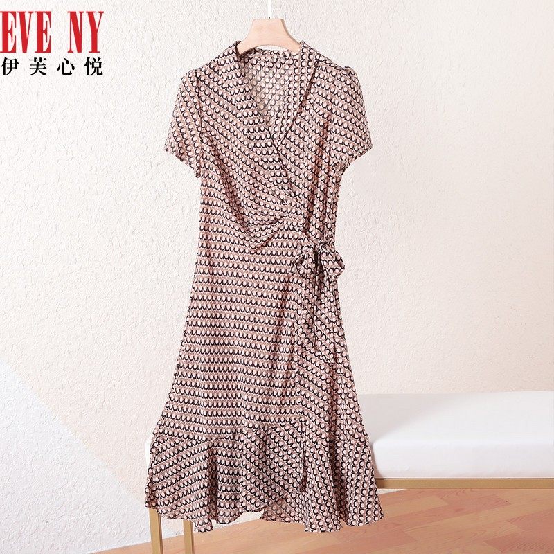 EVENY伊芙心悦春夏季新款优雅印花荷叶边下摆圆领短袖连衣裙