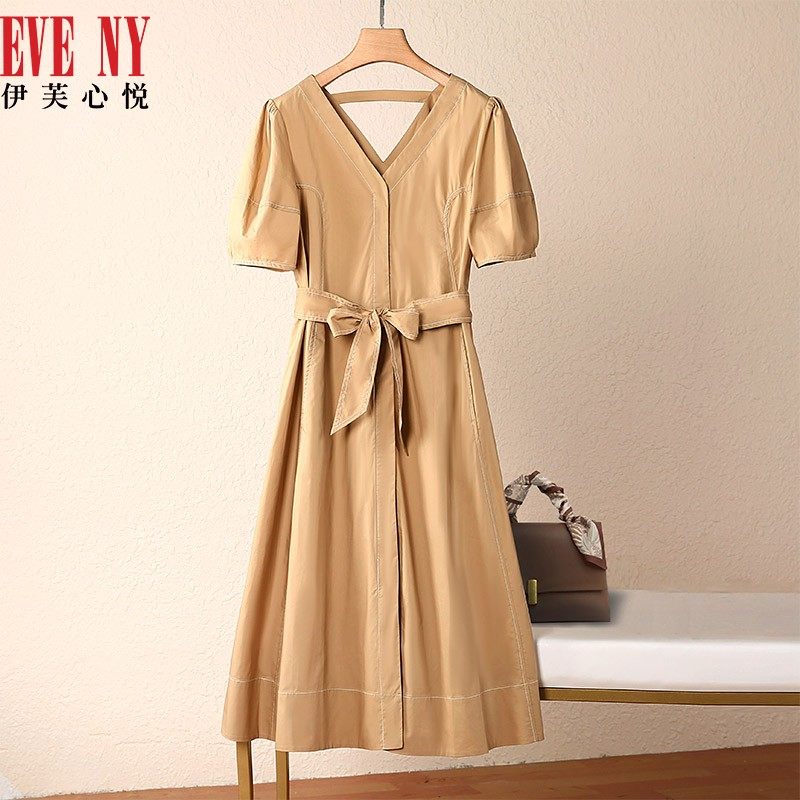 EVENY伊芙心悦夏新款V领短袖A字裙腰带收腰气质通勤连衣裙女