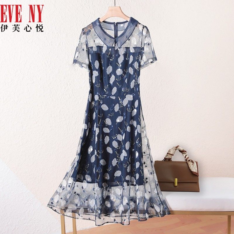 EVENY伊芙心悦春夏季修身典雅蕾丝网纱双层短袖连衣裙