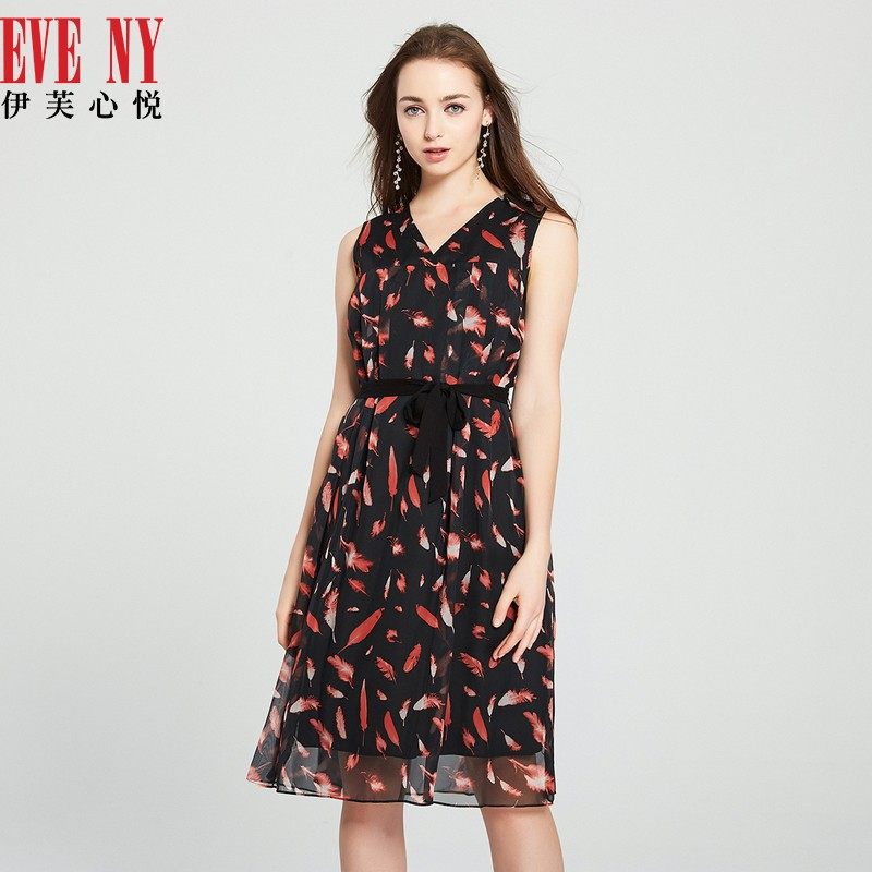 EVENY伊芙心悦春夏季印花V领系带收腰无袖连衣裙