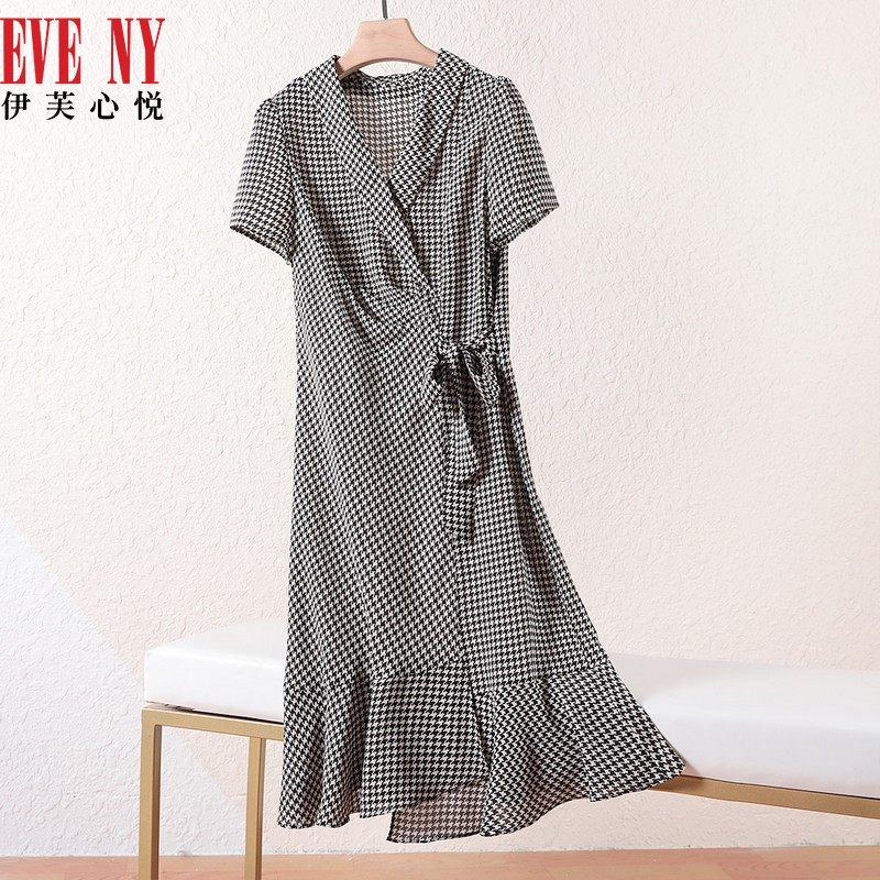 EVENY伊芙心悦天猫定制春夏娃娃领千鸟格收腰显瘦七分袖连衣裙