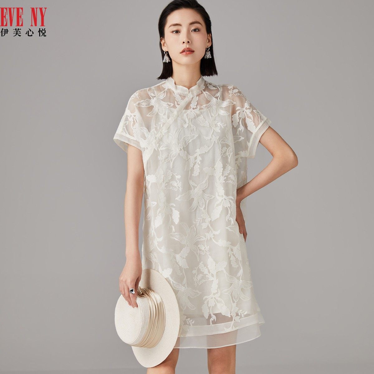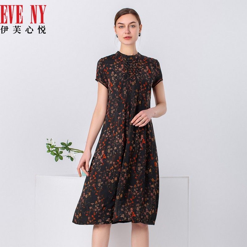 EVENY伊芙心悦2023夏季新款桑蚕丝中式立领绣花真丝旗袍连衣裙女