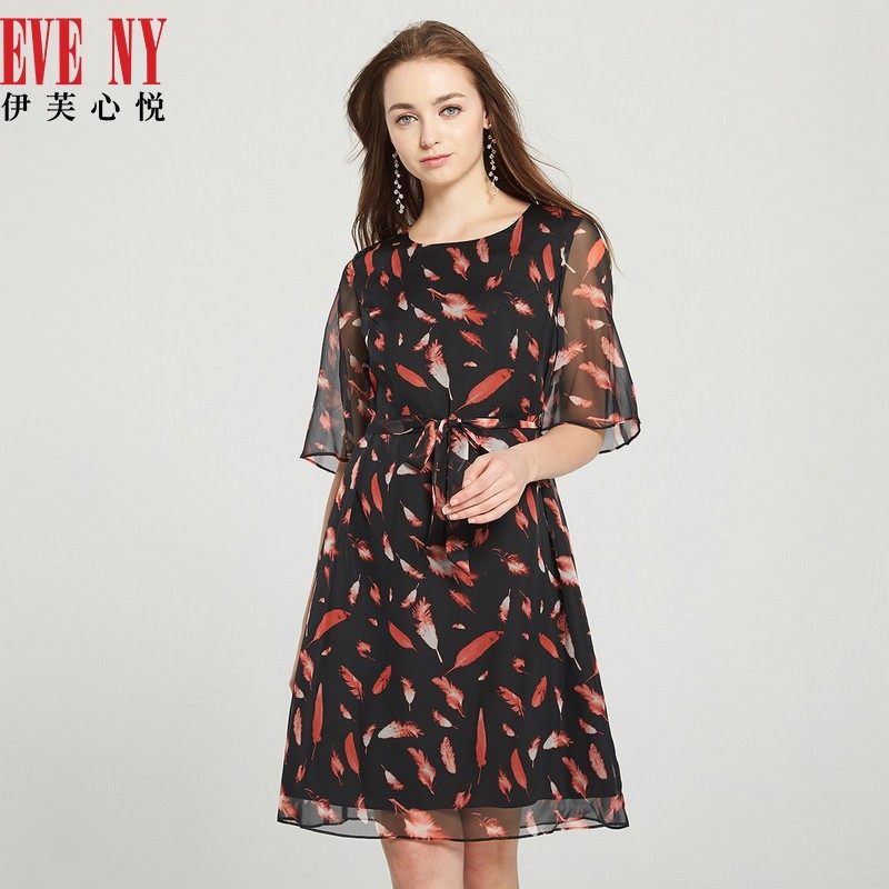EVENY伊芙心悦春夏季印花圆领系带收腰中袖连衣裙