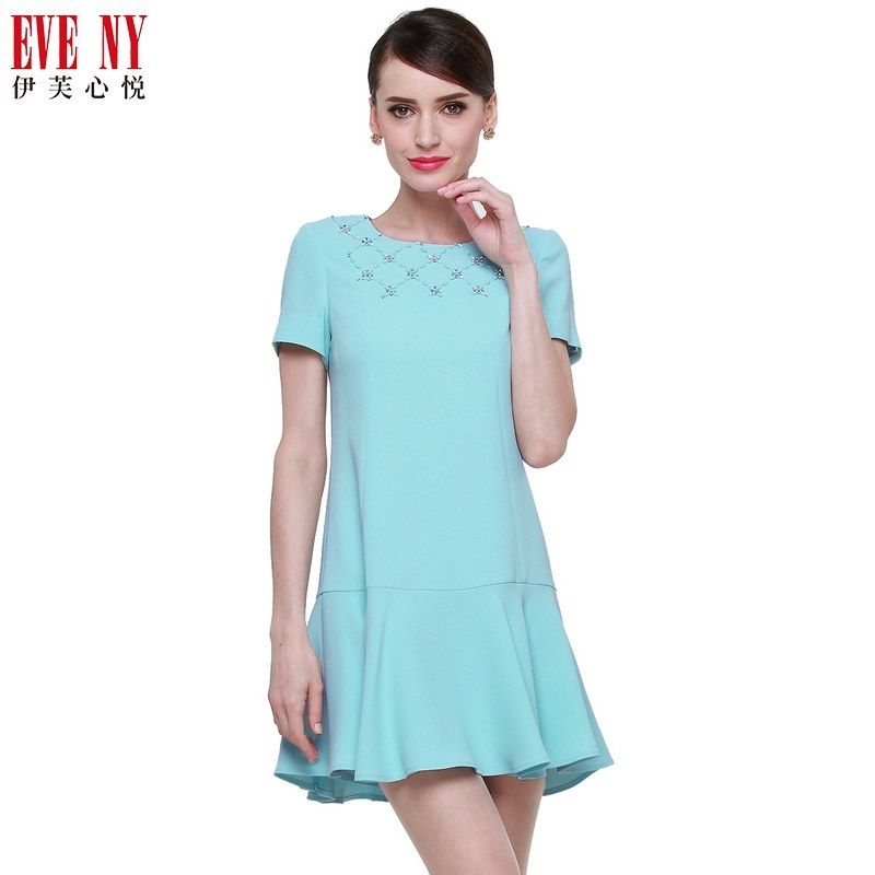 EVENY伊芙心悦春夏季新款时尚钉珠修身剪裁圆领中袖连衣裙