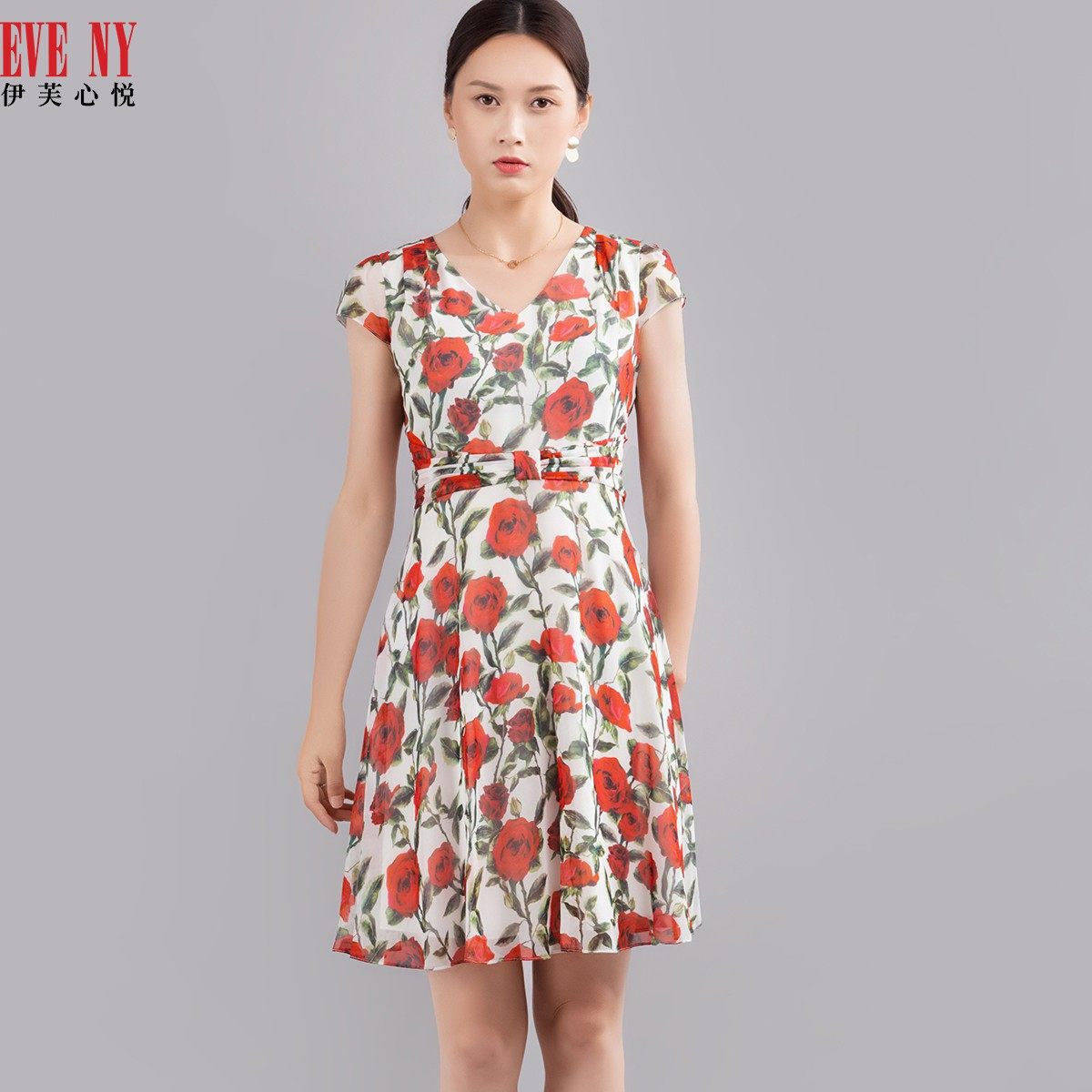 EVENY伊芙心悦热销款优雅清凉桑蚕丝面料玫瑰印花连衣裙女