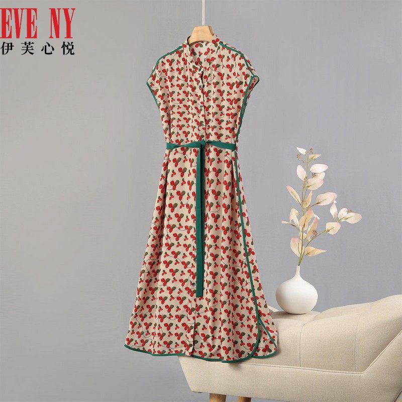 EVENY伊芙心悦春夏季优雅植物印花系带圆领无袖连衣裙