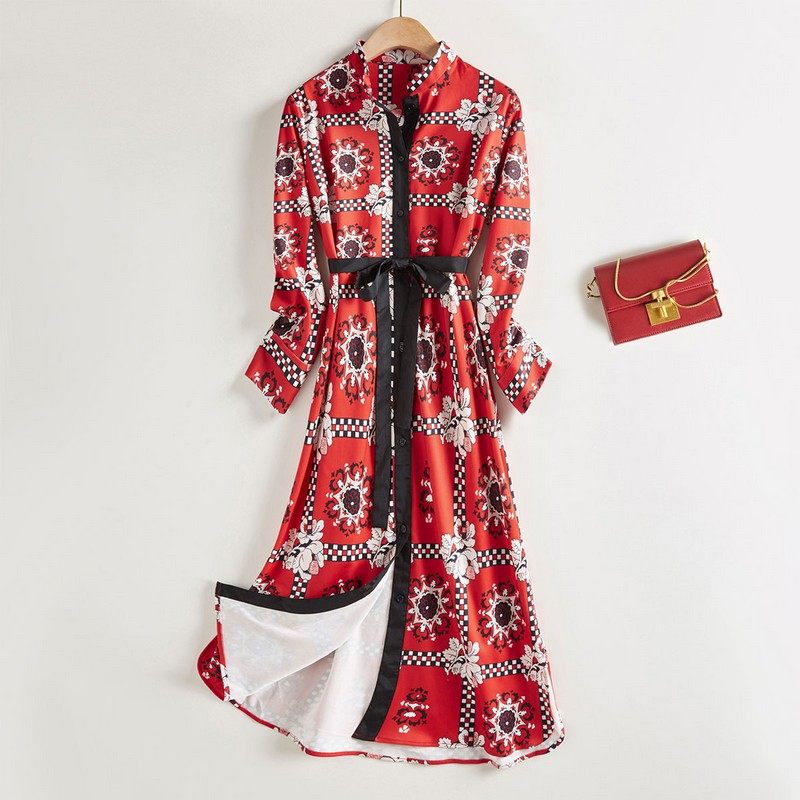 EVENY伊芙心悦热销款垂坠顺滑印花渲染长袖中长款连衣裙女