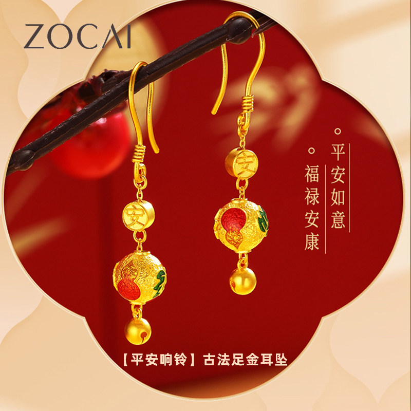 佐卡伊 平安响铃黄金耳饰古法彩色珐琅耳环足金耳坠女款新品珠宝
