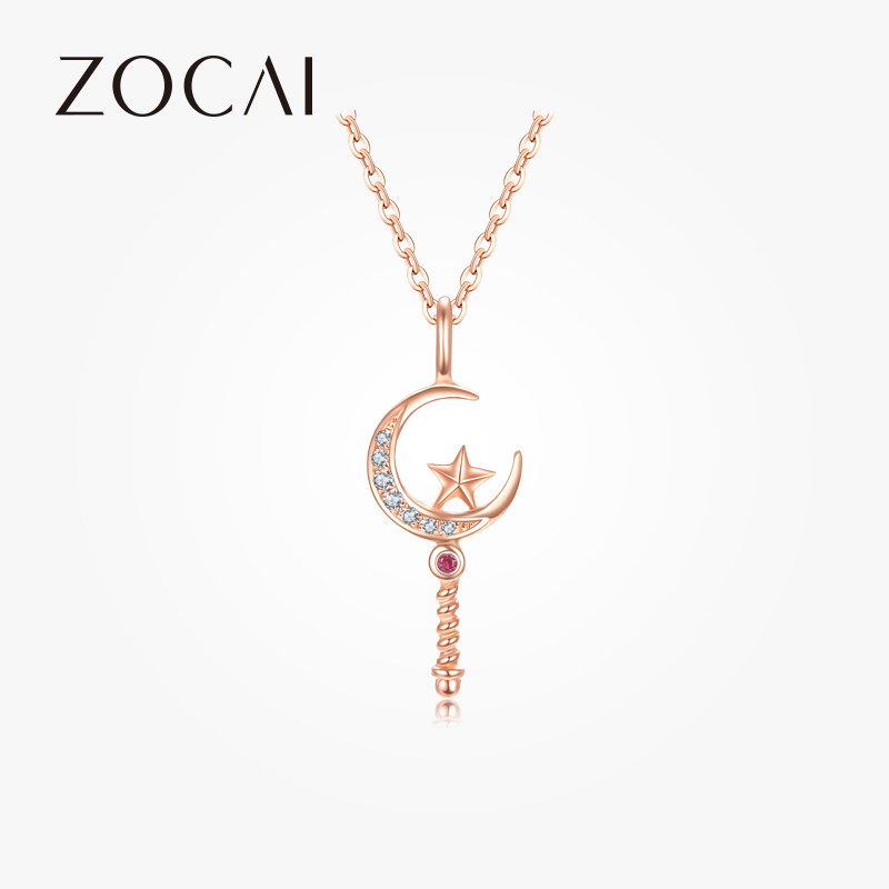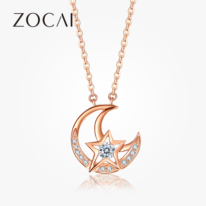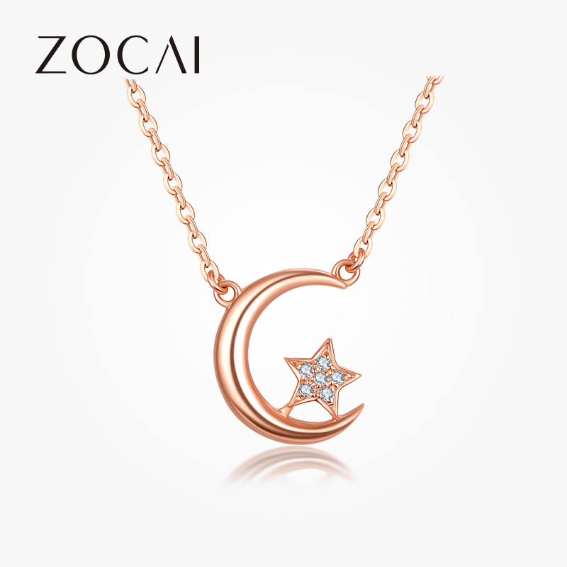 佐卡伊 18k玫瑰金星月钻石项链女真钻彩金星星月亮锁骨链吊坠珠宝