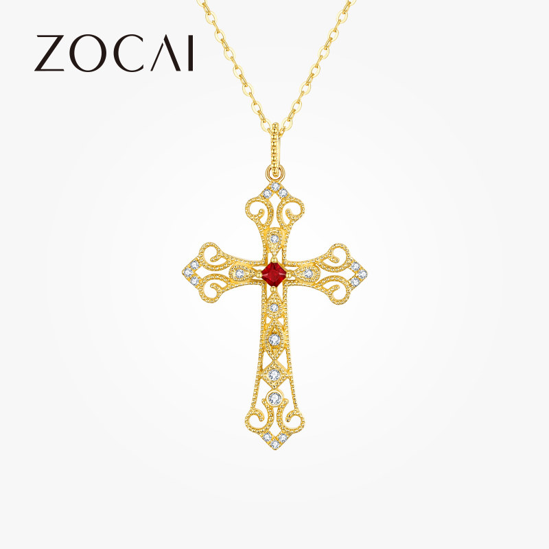佐卡伊 18K金钻石吊坠 彩金红宝石十字架项链