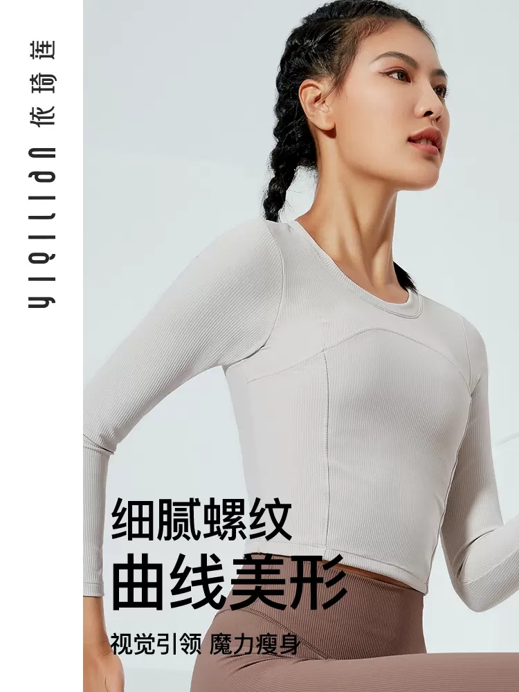 依琦莲瑜伽长袖2023春季新款显瘦褶皱收腰紧身运动透气健身上衣女