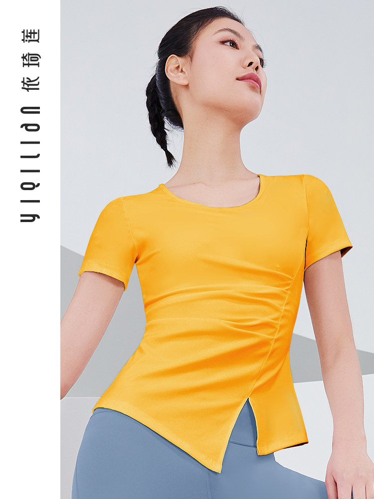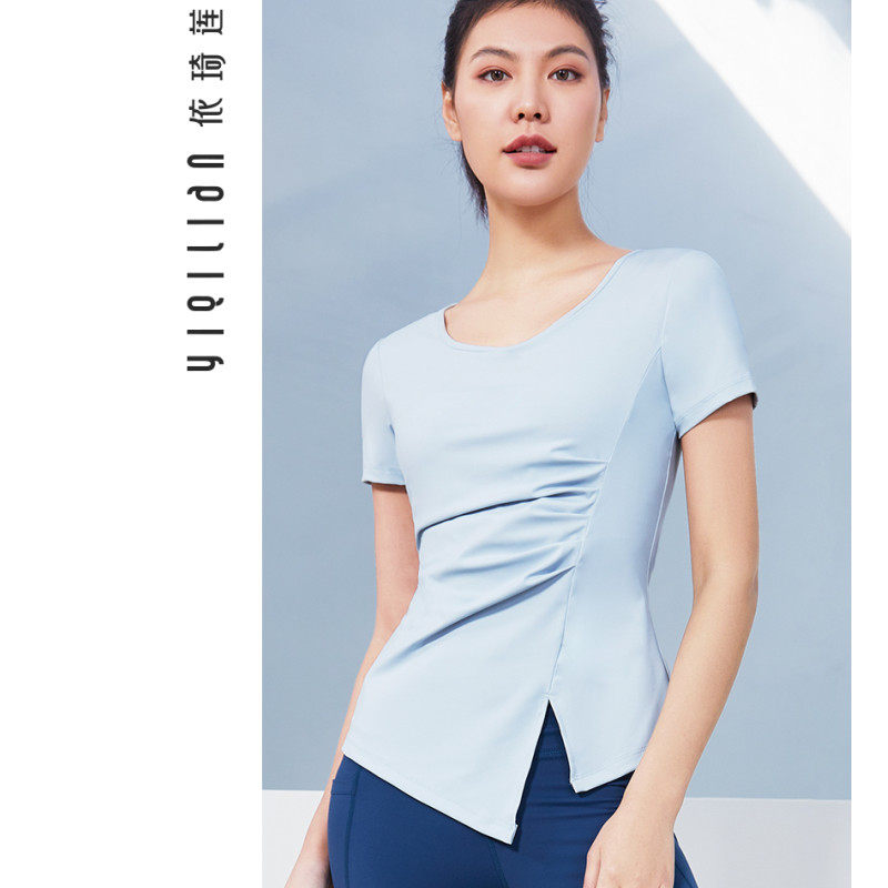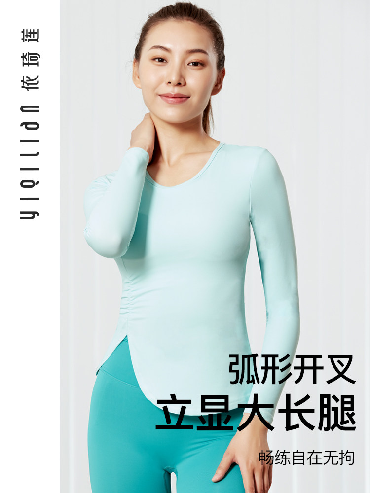 依琦莲瑜伽服T恤分叉捏褶遮腹显瘦健身服运动服跑步普拉提长袖