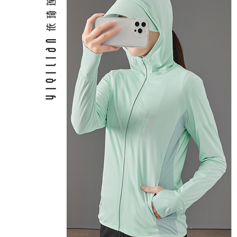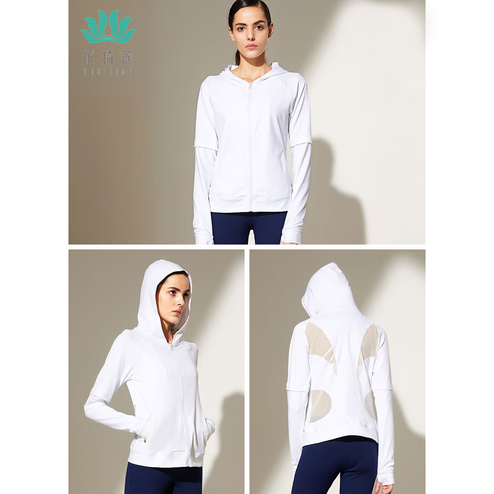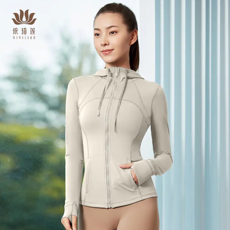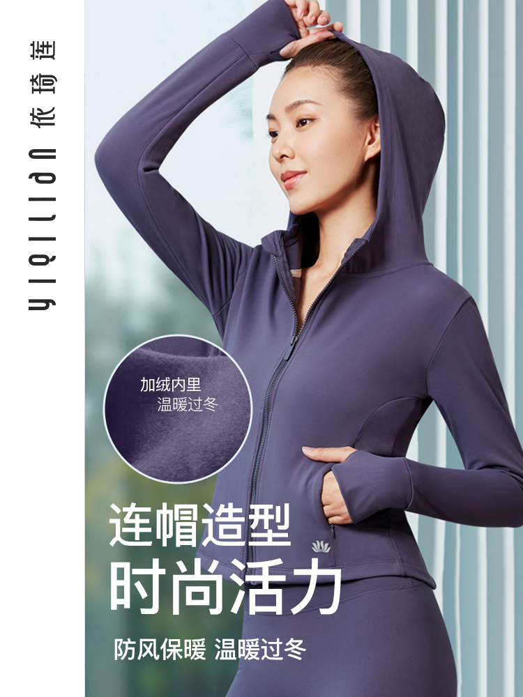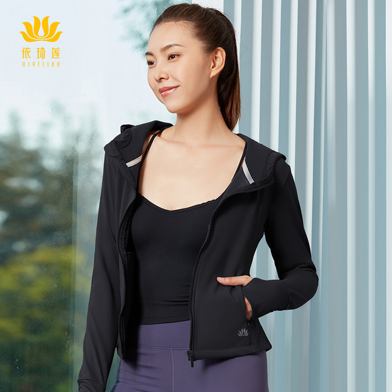 依琦莲女健身上衣长袖透气速干跑步运动服瑜伽外套连帽口袋瑜伽服