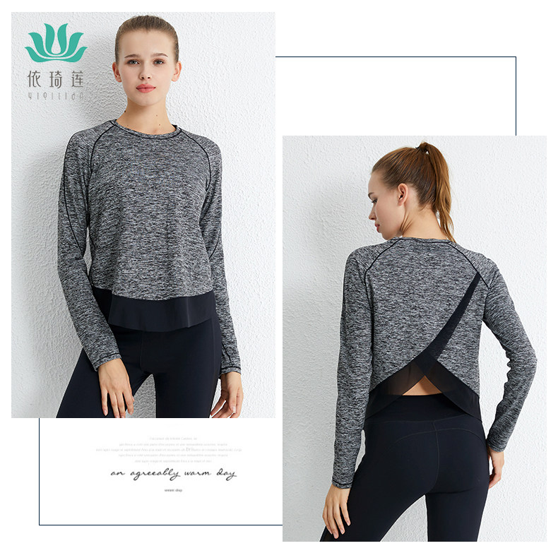 依琦莲秋冬瑜伽服上衣健身房跑步运动女宽松网纱拼接长袖交错美背