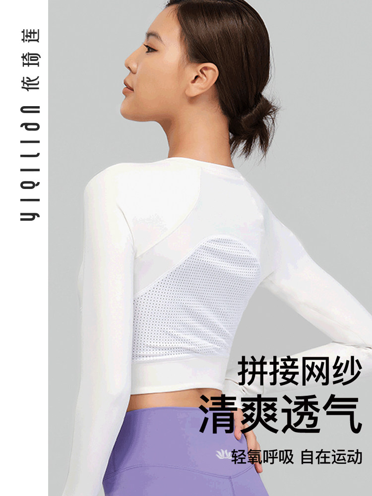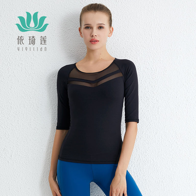 依琦莲春夏四季白色瑜伽服上衣女短袖七分袖圆领网纱拼接轻柔透气