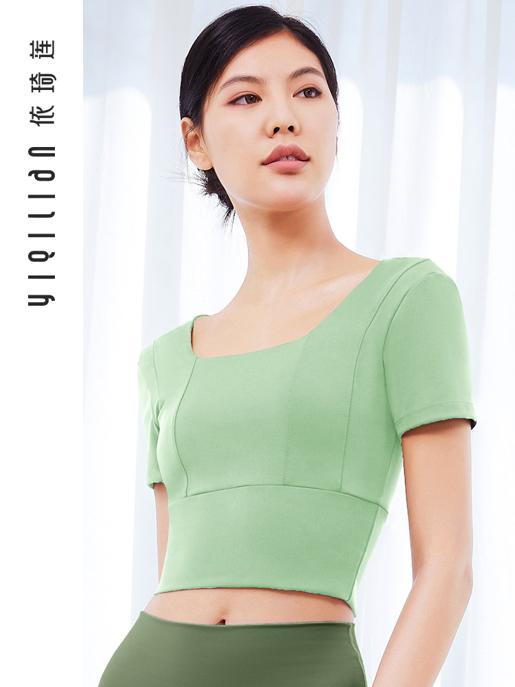 依琦莲夏季清凉健身服女露脐短款跑步运动上衣瑜伽服方领短袖T恤