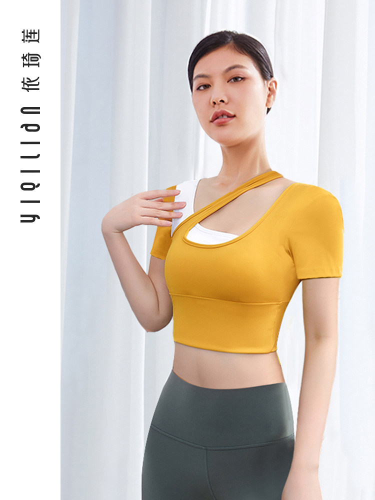依琦莲瑜伽服拼接撞色短袖T恤女短款裸感亲肤斜肩运动加宽上衣