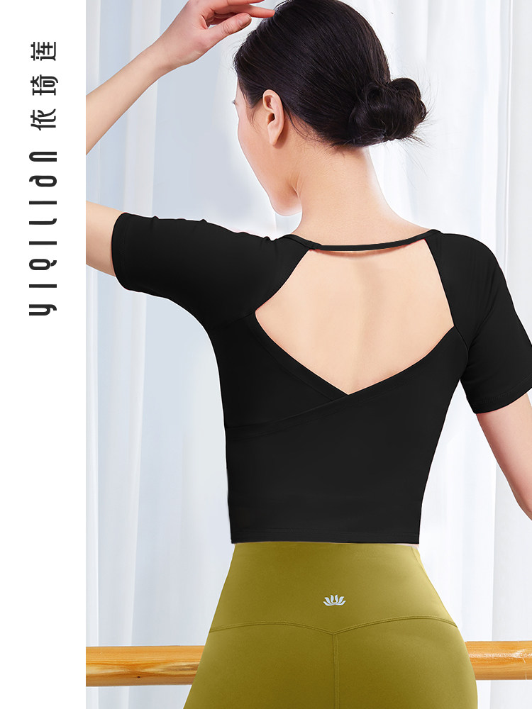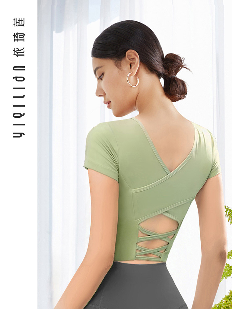 依琦莲春夏瑜伽服女短袖一体杯美背镂空交叉带纯色健身服紧身上衣