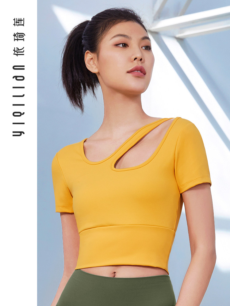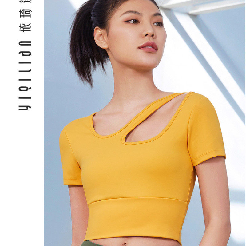 依琦莲夏季新款上衣健身服女紧身T恤斜肩瑜伽服跑步短袖运动时尚