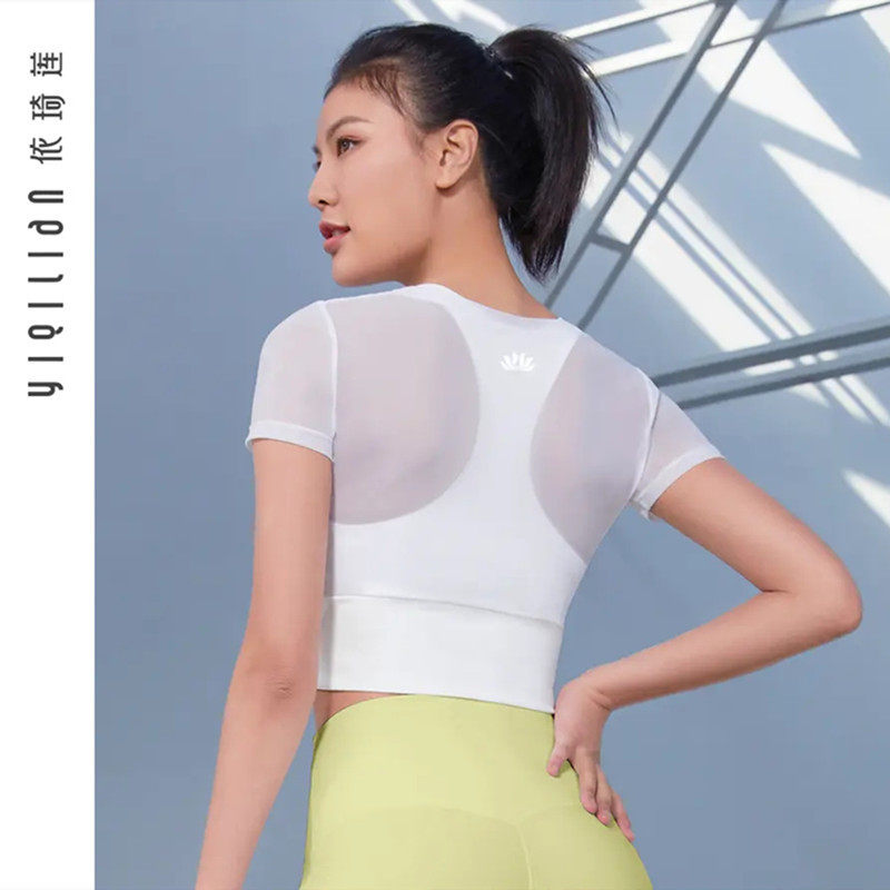 依琦莲瑜伽服T恤透气网眼简约圆领扣手运动上衣短款健身跑步服