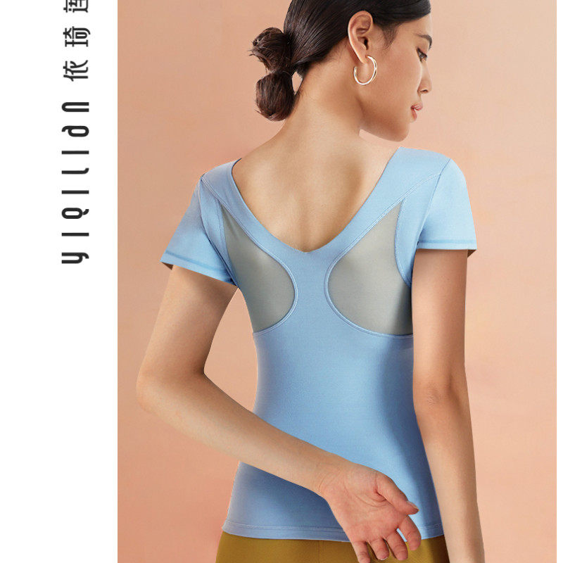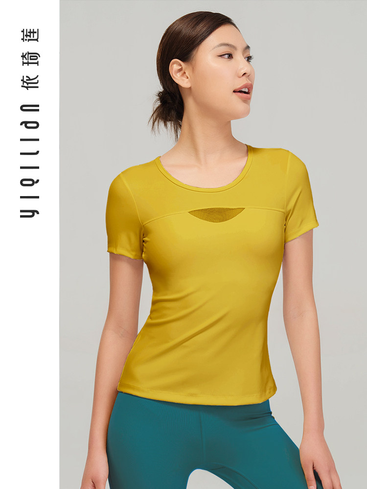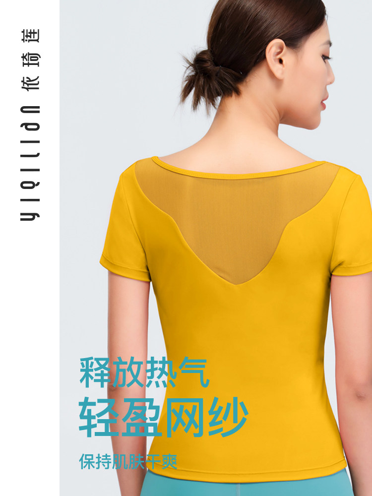 依琦莲春夏季瑜伽服圆领短袖T恤女网纱拼接透气健身服运动跑步服