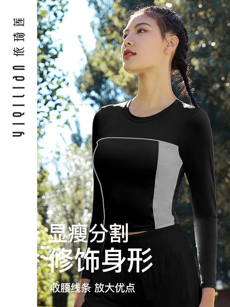 依琦莲瑜伽服T恤长袖撞色拼接修身显瘦线条健身服运动服短款上衣