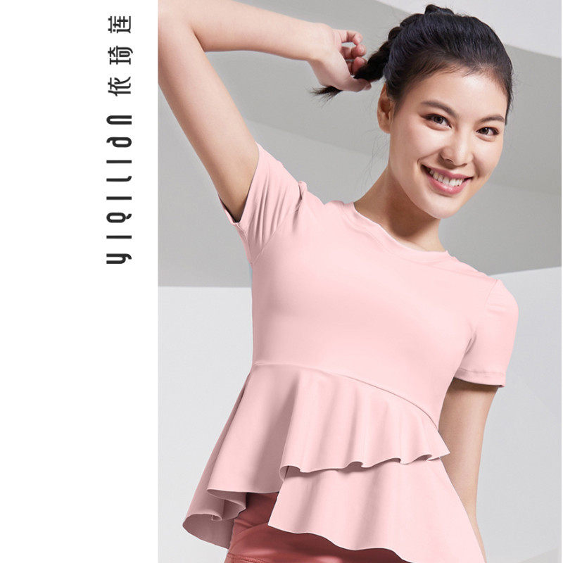 依琦莲瑜伽短袖T恤女荷叶边遮肉显瘦简约圆领健身服外穿运动上衣