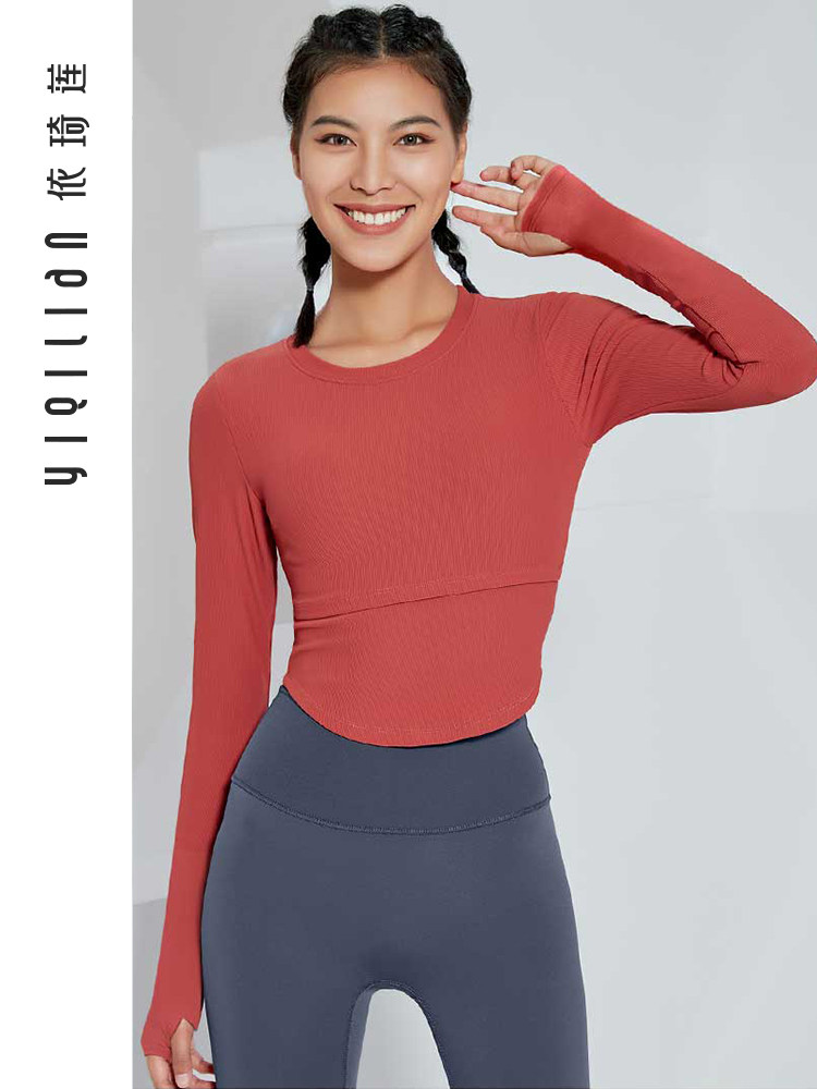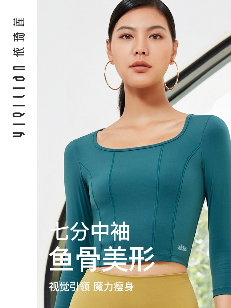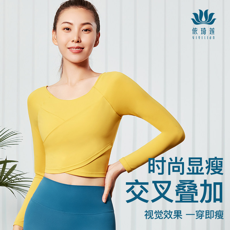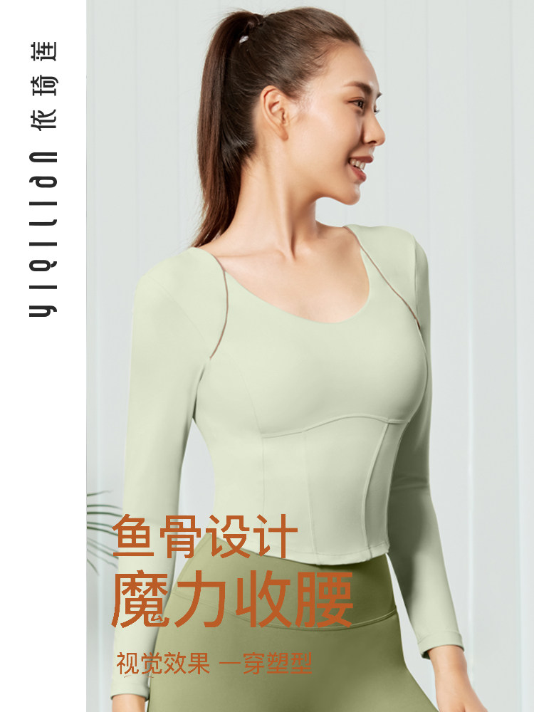 依琦莲瑜伽服女T恤长袖显瘦一体杯健身服插肩运动普拉提训练上衣
