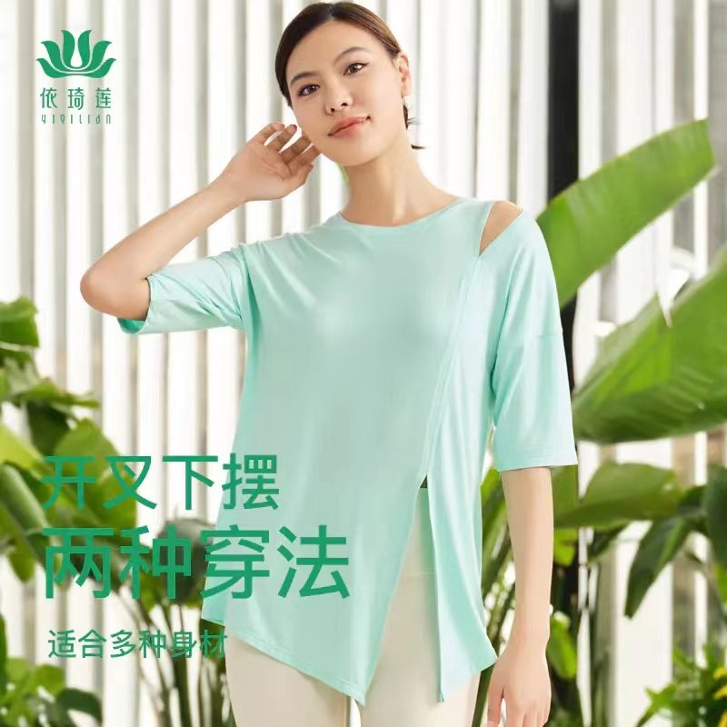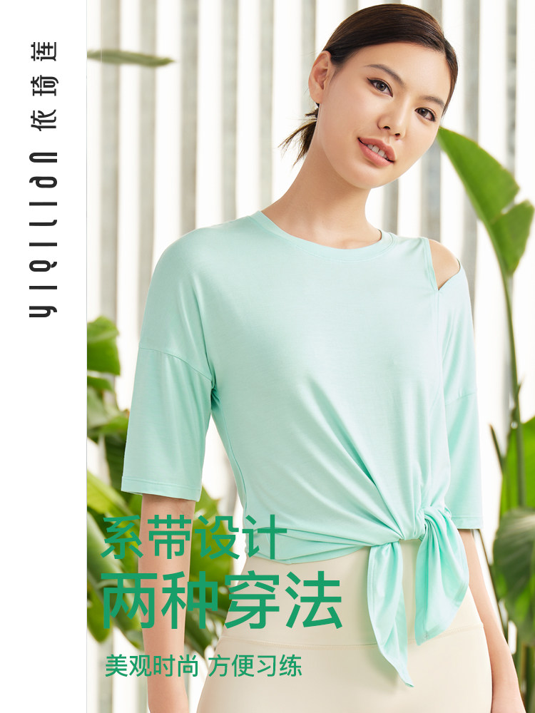 依琦莲夏瑜伽服女中袖上衣宽松露肩开叉系带运动健身T恤亲肤透气