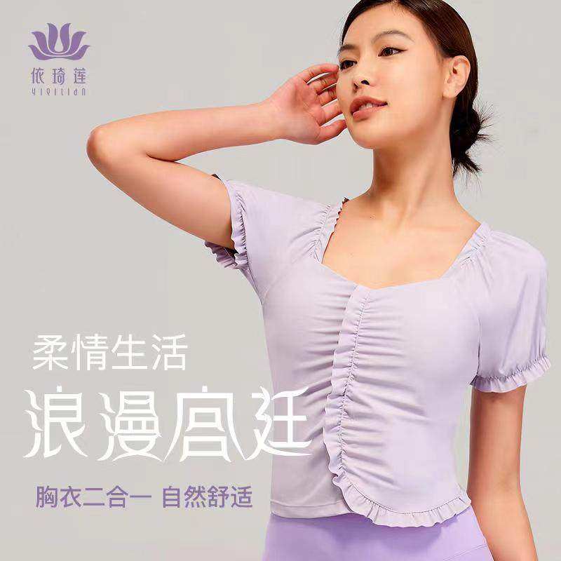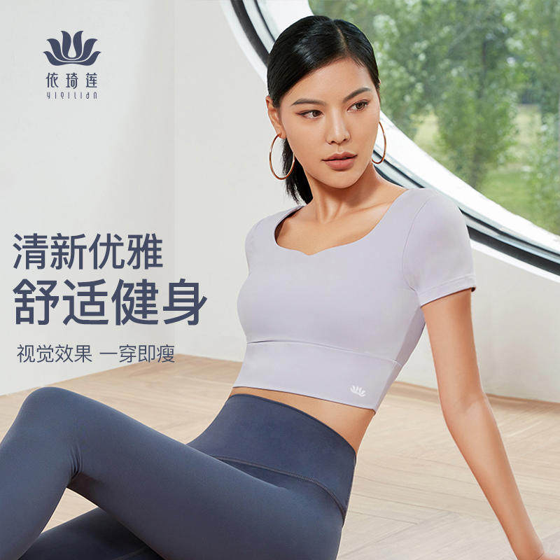 依琦莲瑜伽服T恤春夏新款遮腹褶皱健身服运动服一体杯裸感上衣