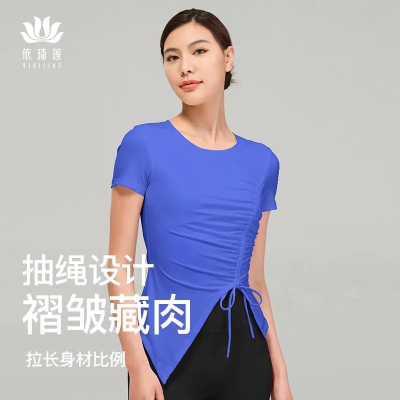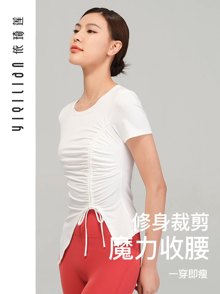 依琦莲瑜伽服短袖T恤侧面堆堆抽绳不规则下摆上衣圆领运动健身服