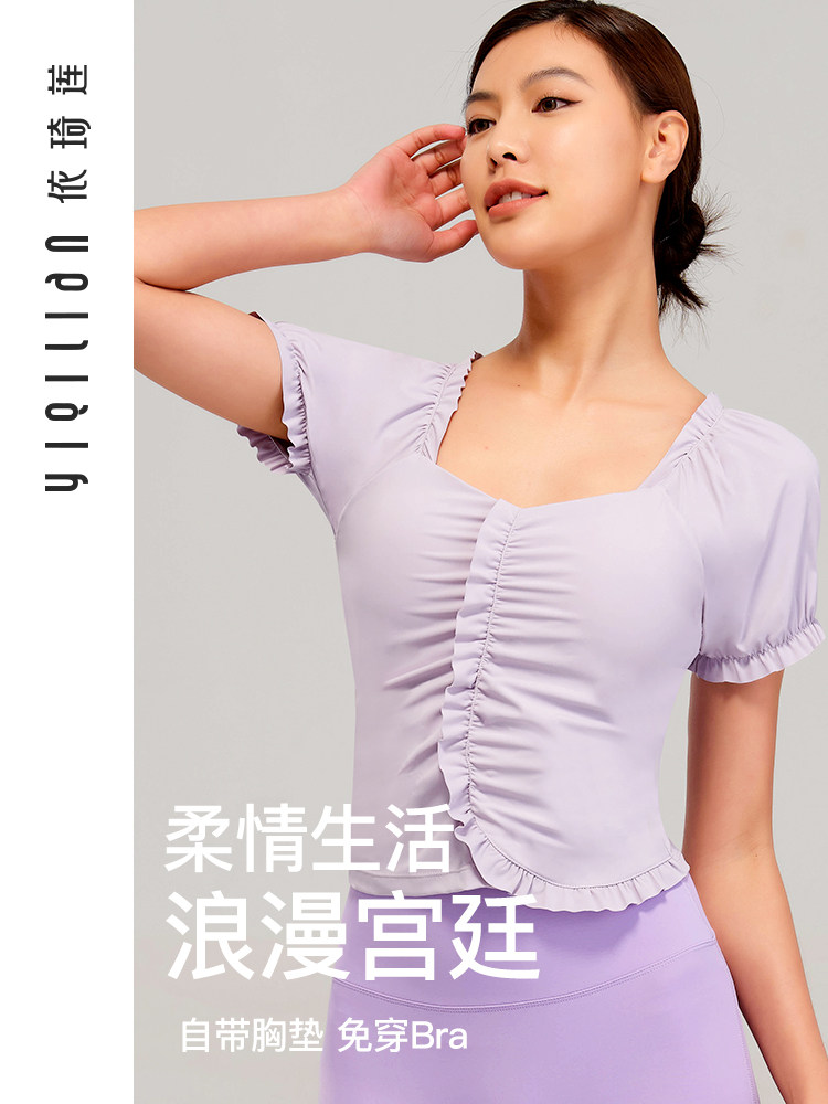 依琦莲瑜伽服女短袖T恤宫廷风捏褶花边浪漫优雅裸感纯色健身上衣