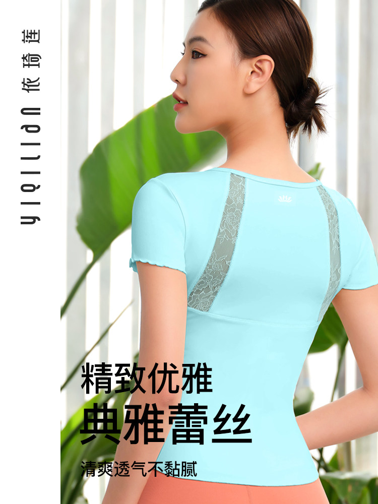 依琦莲春夏薄款瑜伽服圆领短袖T恤蕾丝拼接花边健身服女运动上衣