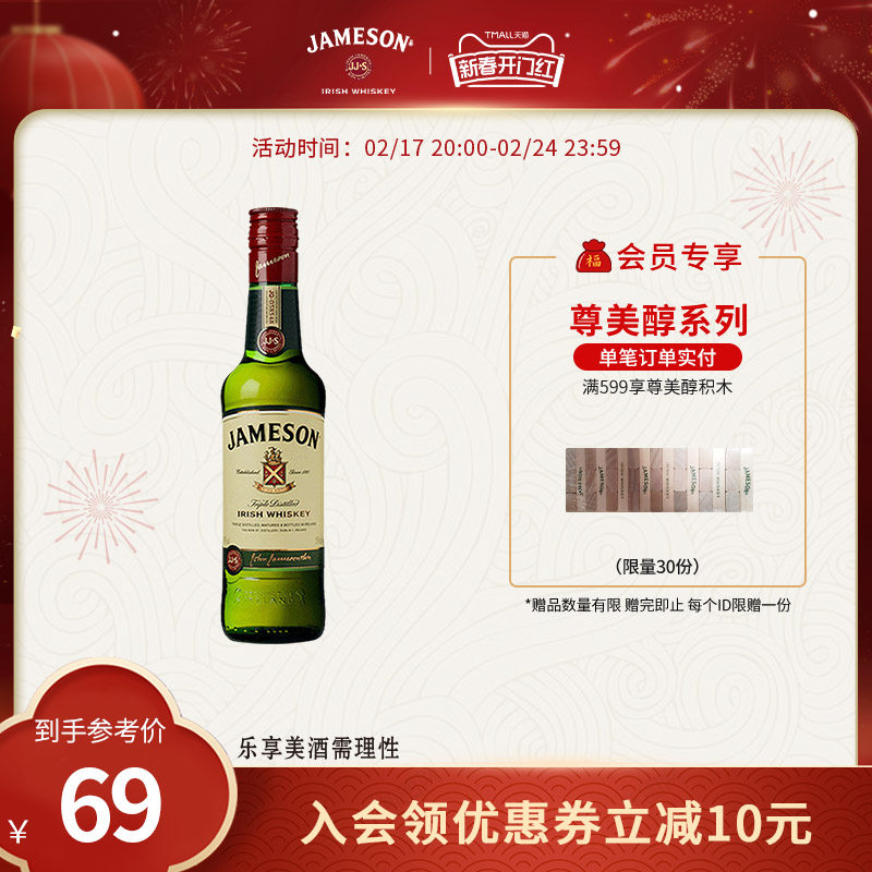 Jameson尊美醇爱尔兰威士忌350ml进口洋酒烈酒调酒基酒官方旗舰店