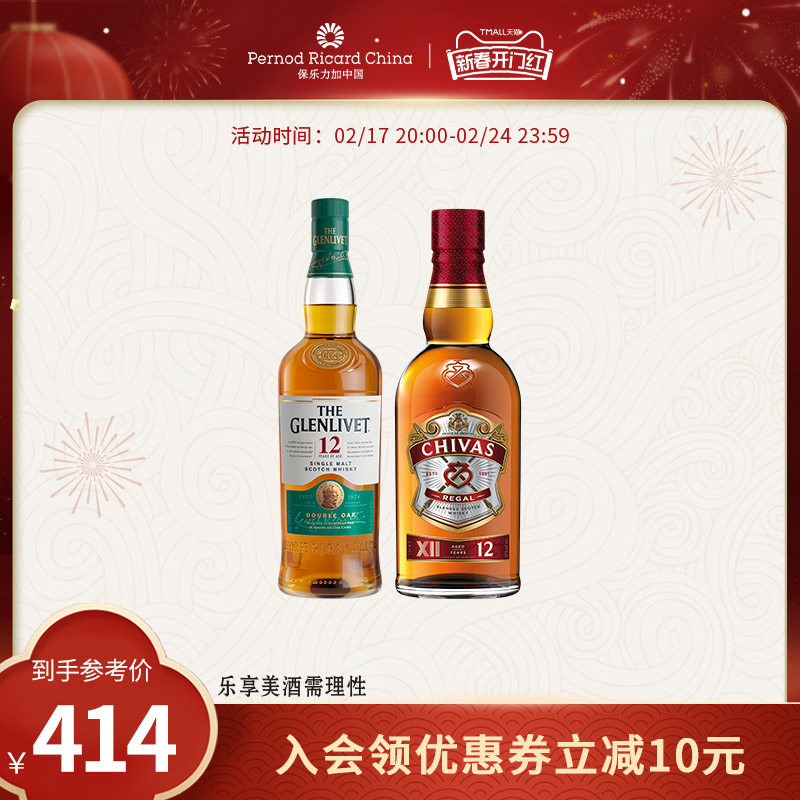 格兰威特12年陈酿单一麦芽700ml+芝华士威士忌12年500ml洋酒组合