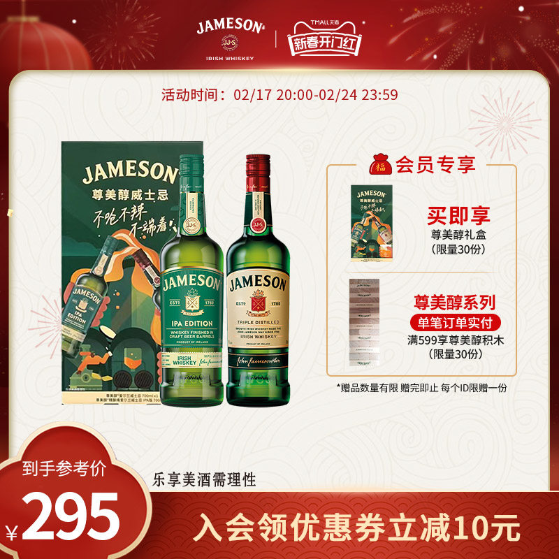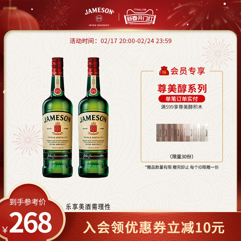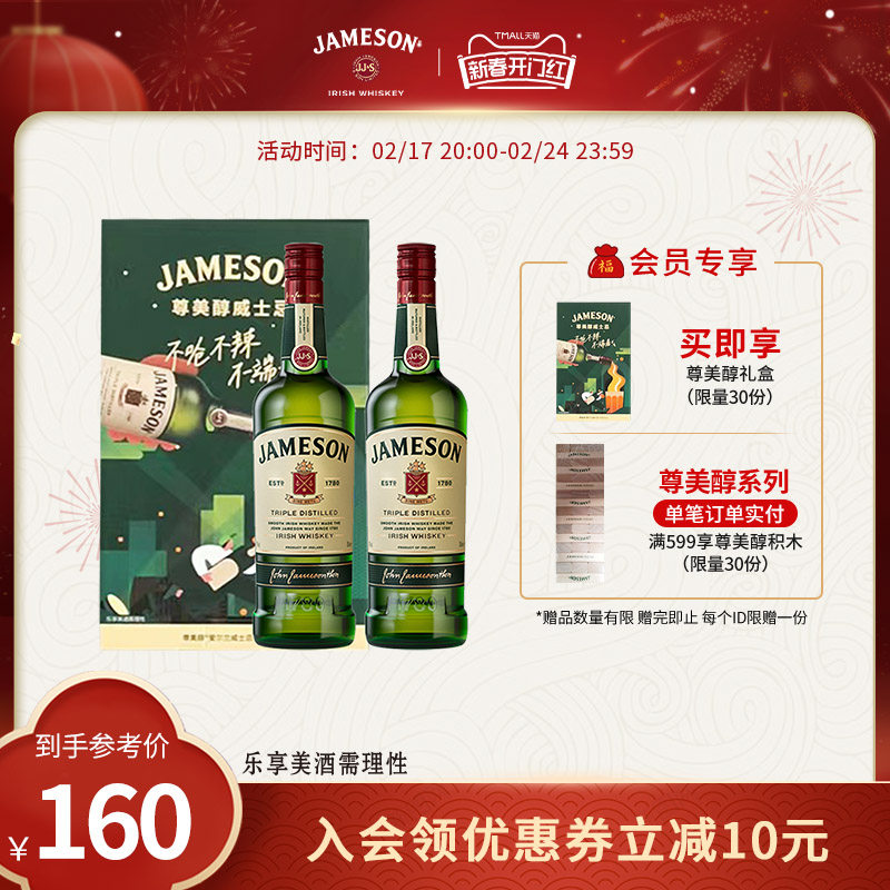 Jameson尊美醇爱尔兰威士忌500ml*2洋酒烈酒特调酒基酒组合套装